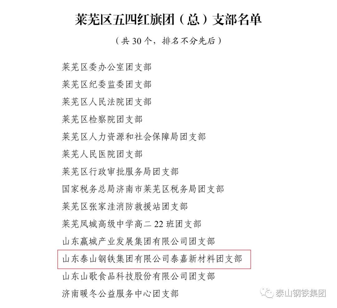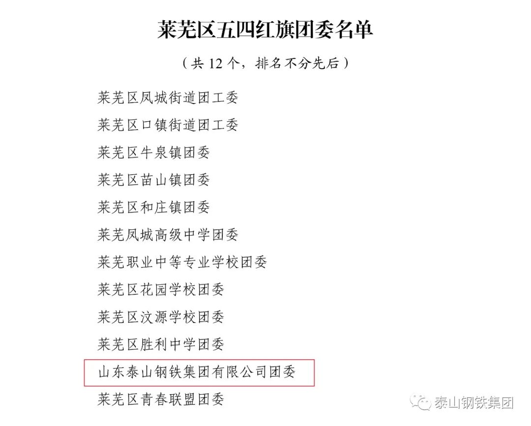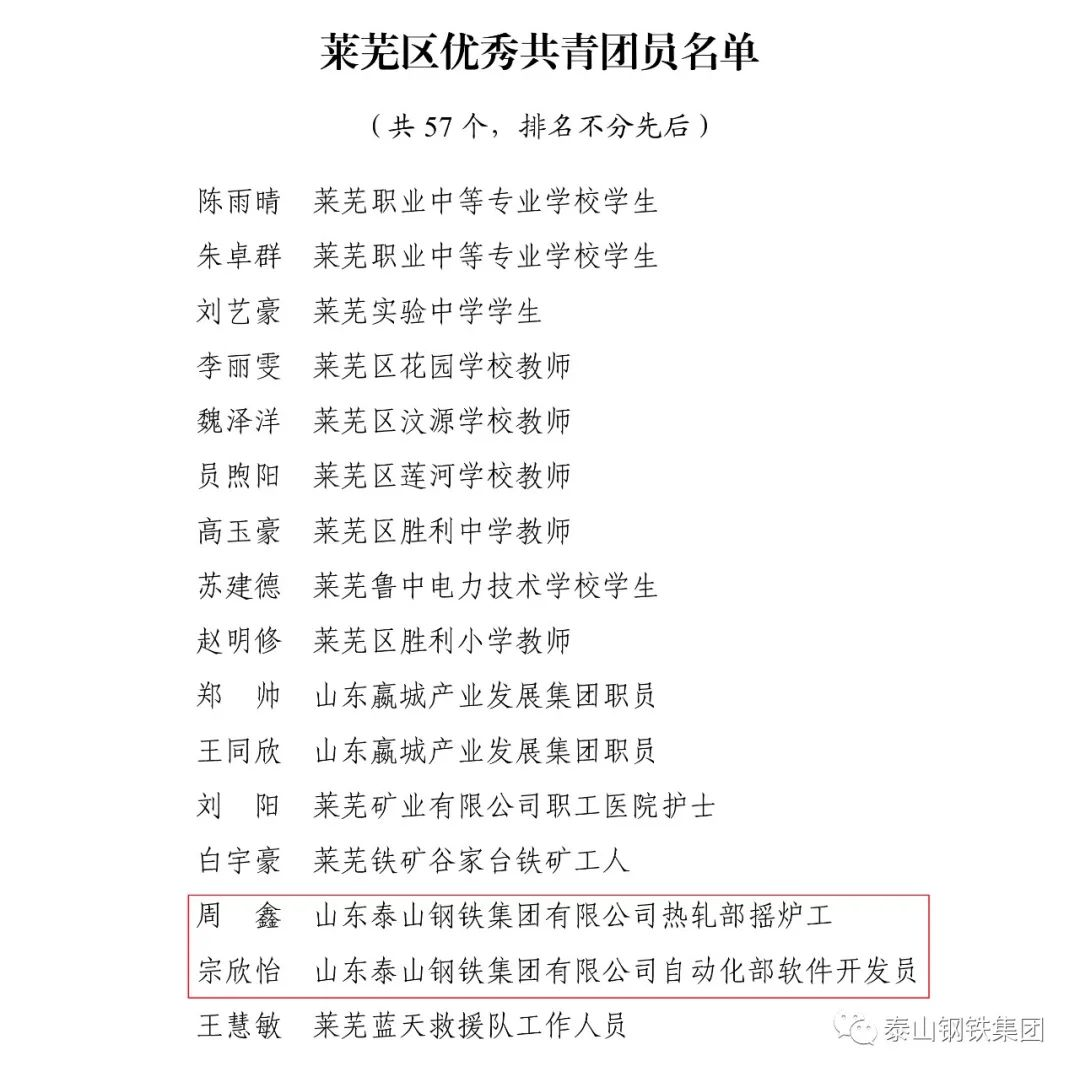 近日,共青团济南市莱芜区委下发文件《关于2022年度莱芜区五四典型的表扬通报》,表彰了一批先进单位和个人。其中,泰山钢铁集团团委上榜“莱芜区五四红旗团委”名单,泰嘉新材料团支部上榜“莱芜区五四红旗团(总)支部名单”,职工周鑫、宗欣怡上榜“莱芜区优秀共青团员名单”,职工李娟上榜“莱芜区优秀共青团干部名单”,职工亓敬坤、刘兆国被评为“莱芜区青年志愿者优秀个人”,时博(中国)青年志愿者服务队“打造幸福城市,送温暖进山村”志愿服务项目被评为“莱芜区青年志愿者优秀项目”。