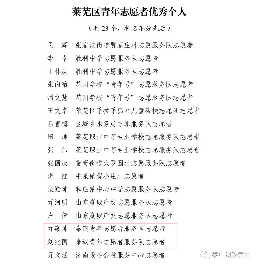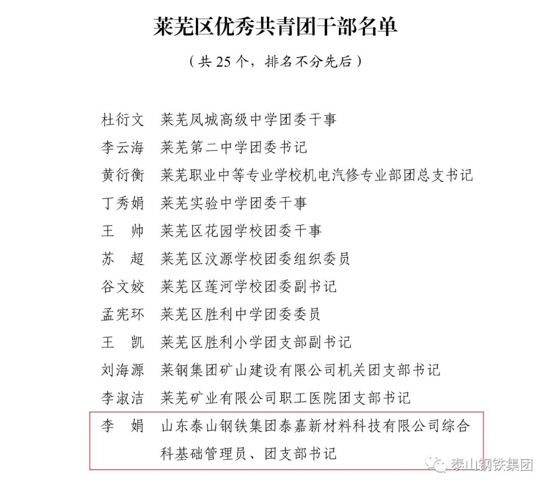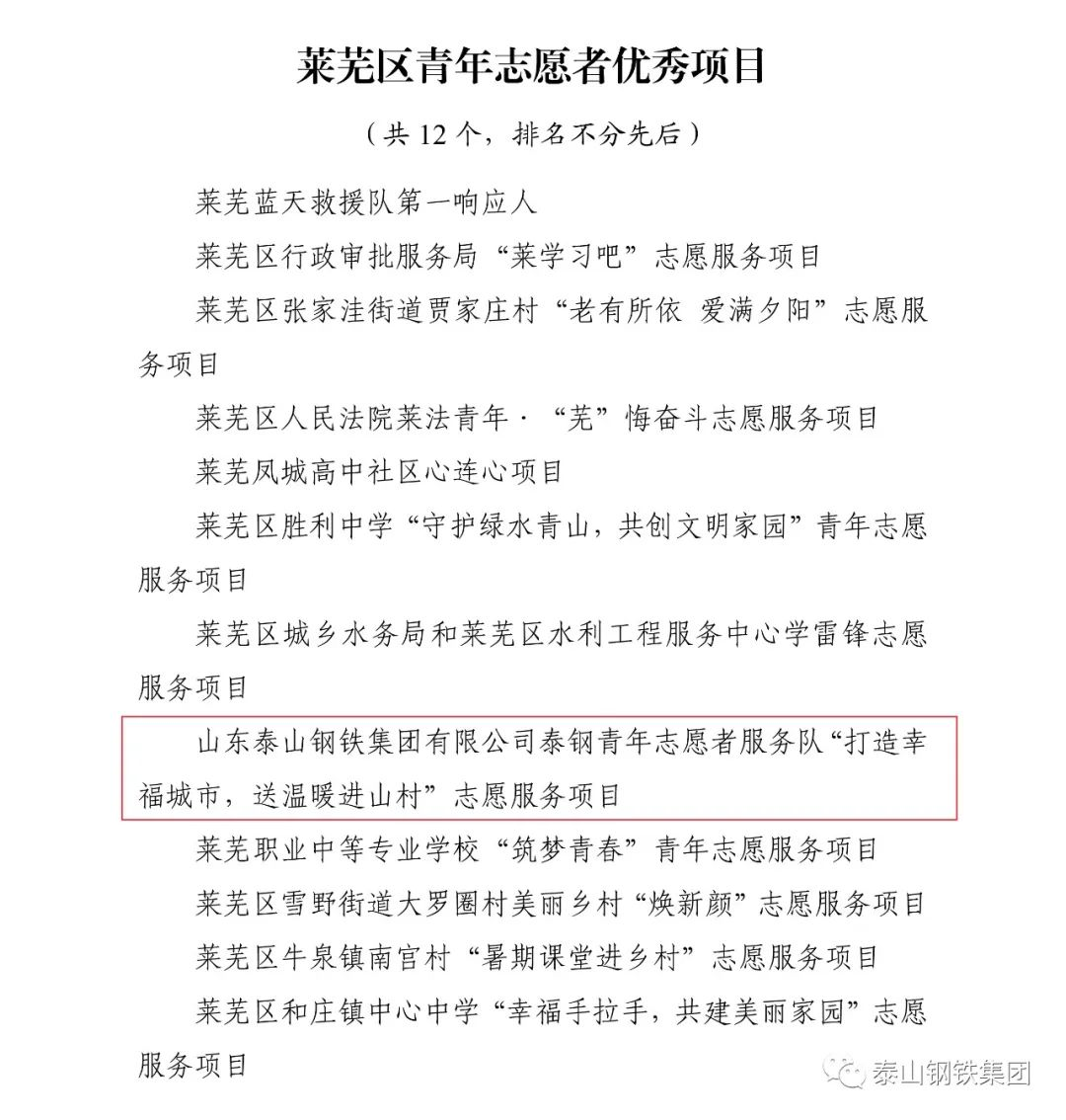 近日,共青团济南市莱芜区委下发文件《关于2022年度莱芜区五四典型的表扬通报》,表彰了一批先进单位和个人。其中,泰山钢铁集团团委上榜“莱芜区五四红旗团委”名单,泰嘉新材料团支部上榜“莱芜区五四红旗团(总)支部名单”,职工周鑫、宗欣怡上榜“莱芜区优秀共青团员名单”,职工李娟上榜“莱芜区优秀共青团干部名单”,职工亓敬坤、刘兆国被评为“莱芜区青年志愿者优秀个人”,时博(中国)青年志愿者服务队“打造幸福城市,送温暖进山村”志愿服务项目被评为“莱芜区青年志愿者优秀项目”。