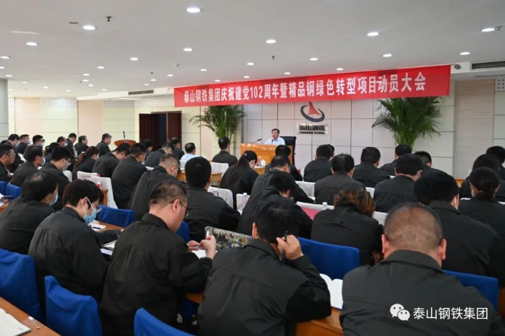 这是集团喜迎中国共产党成立102周年华诞的庆祝大会,也是号召全体干部职工团结一心、斗志昂扬地推进精品钢绿色转型项目的的动员大会。会上,王董事长重温了党的历史,总结了今年上半年的工作,重点部署了精品钢绿色转型项目的建设任务。