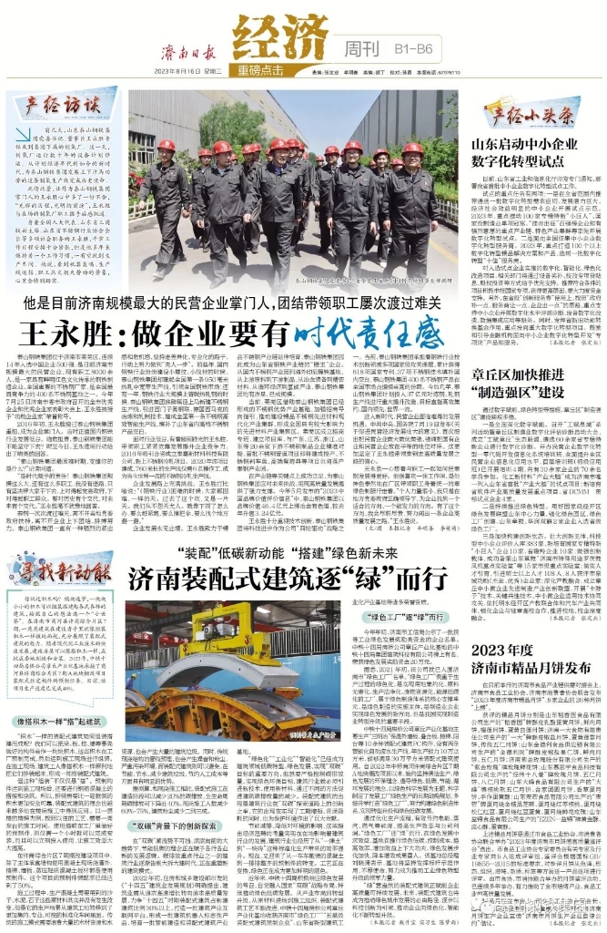 泰山钢铁集团位于济南市莱芜区,连续14年入选中国企业500强,是目前济南规模最大的民营企业,现有职工8000余人,是一家具有鲜明红色文化传承的钢铁制造企业、全国重要的不锈钢厂家,是全国最具竞争力的400系不锈钢基地之一。今年7月25日市委、市政府召开的全市优秀企业和优秀企业家表彰大会上,王永胜被授予“功勋企业家”荣誉称号。