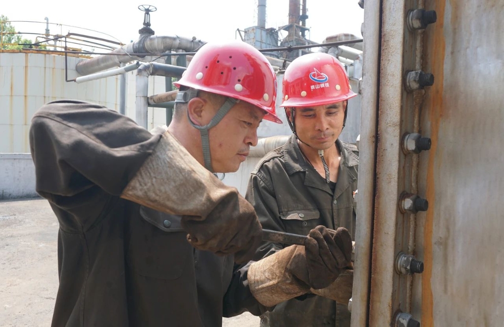方案刚定,党员孟祥鹏立刻站出来:“高空作业我熟,我来!”他系上安全绳,随着吊车升至半空,在煤气管道旁谨慎调整,稳稳固定抱箍,保障了生产的稳定顺行。